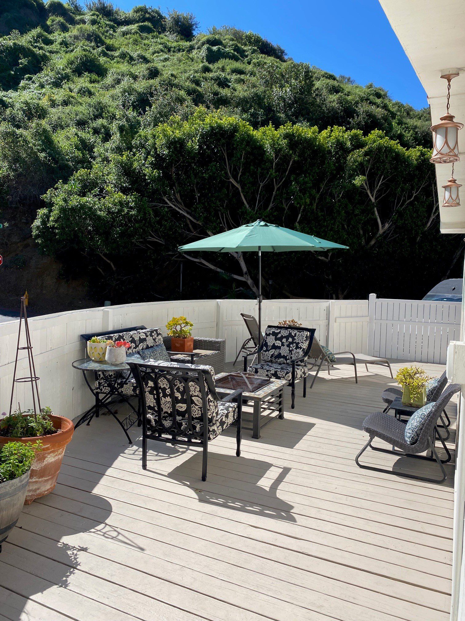 Lovingly owned for over 30 years, this home blends comfort, charm, and effortless style with a relaxed boho-chic aesthetic. Enter through a freshly painted white picket fence into lush landscaping, a blooming lemon tree, and inviting outdoor spaces. A spacious wraparound wood deck creates the perfect setting for dining, entertaining, or enjoying sunset views.